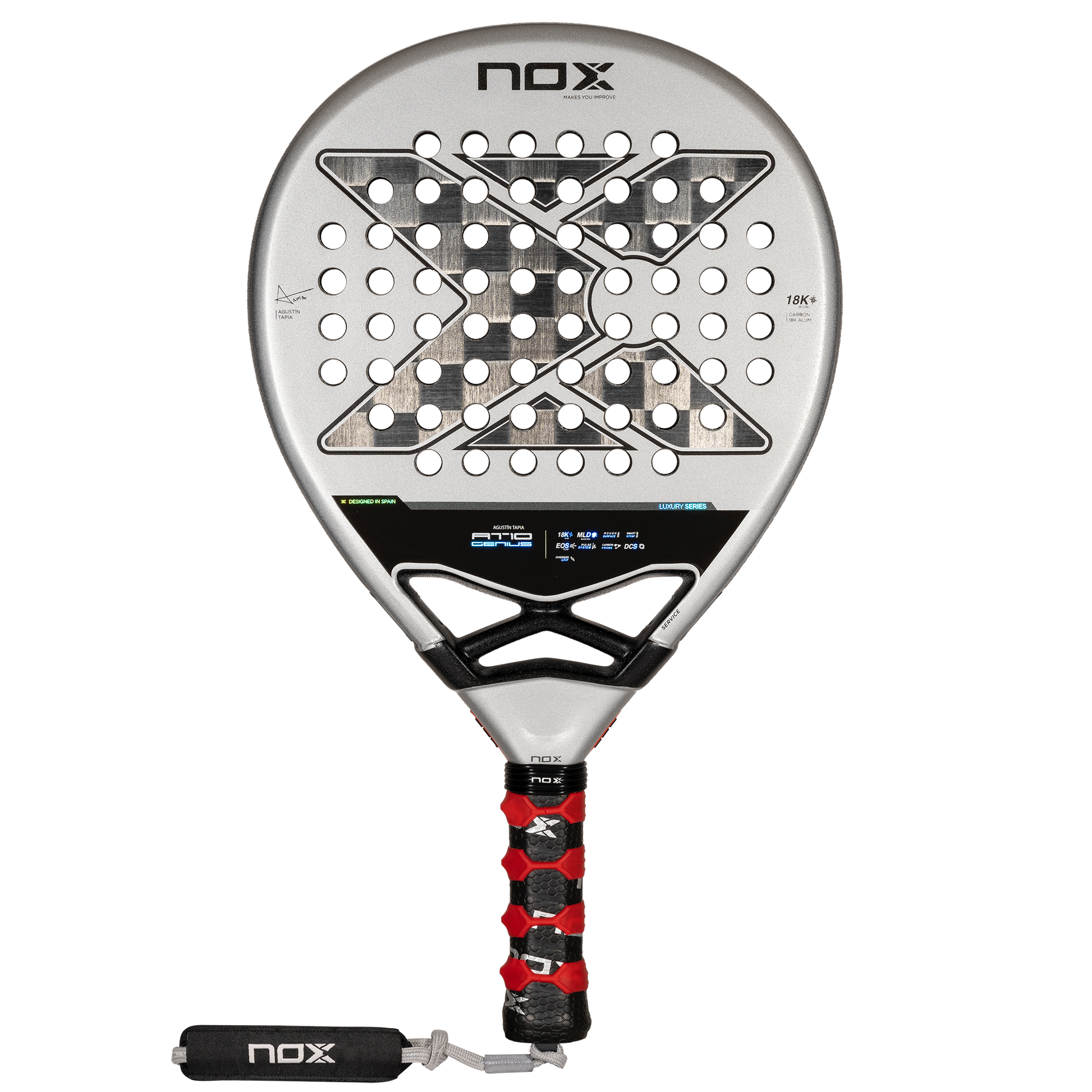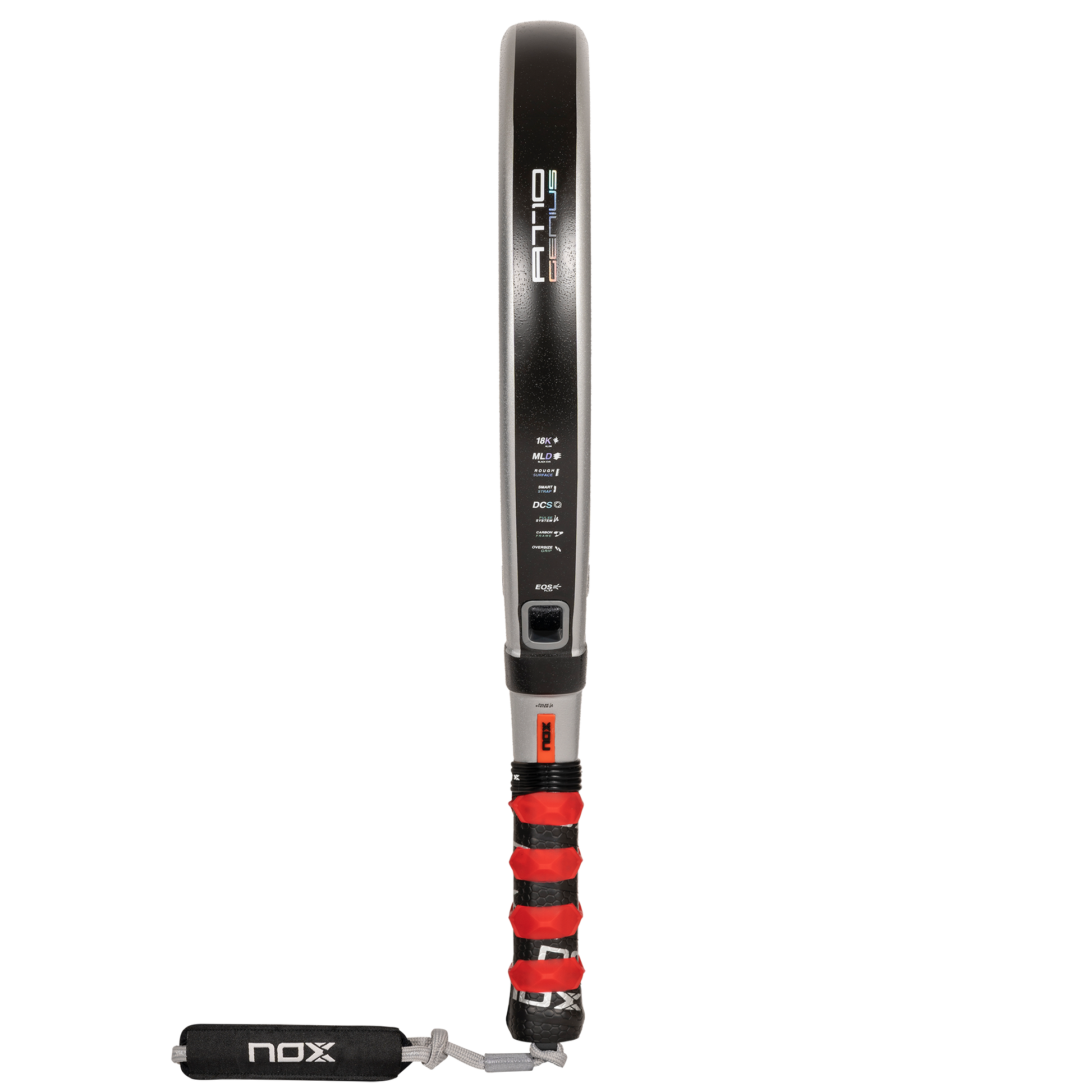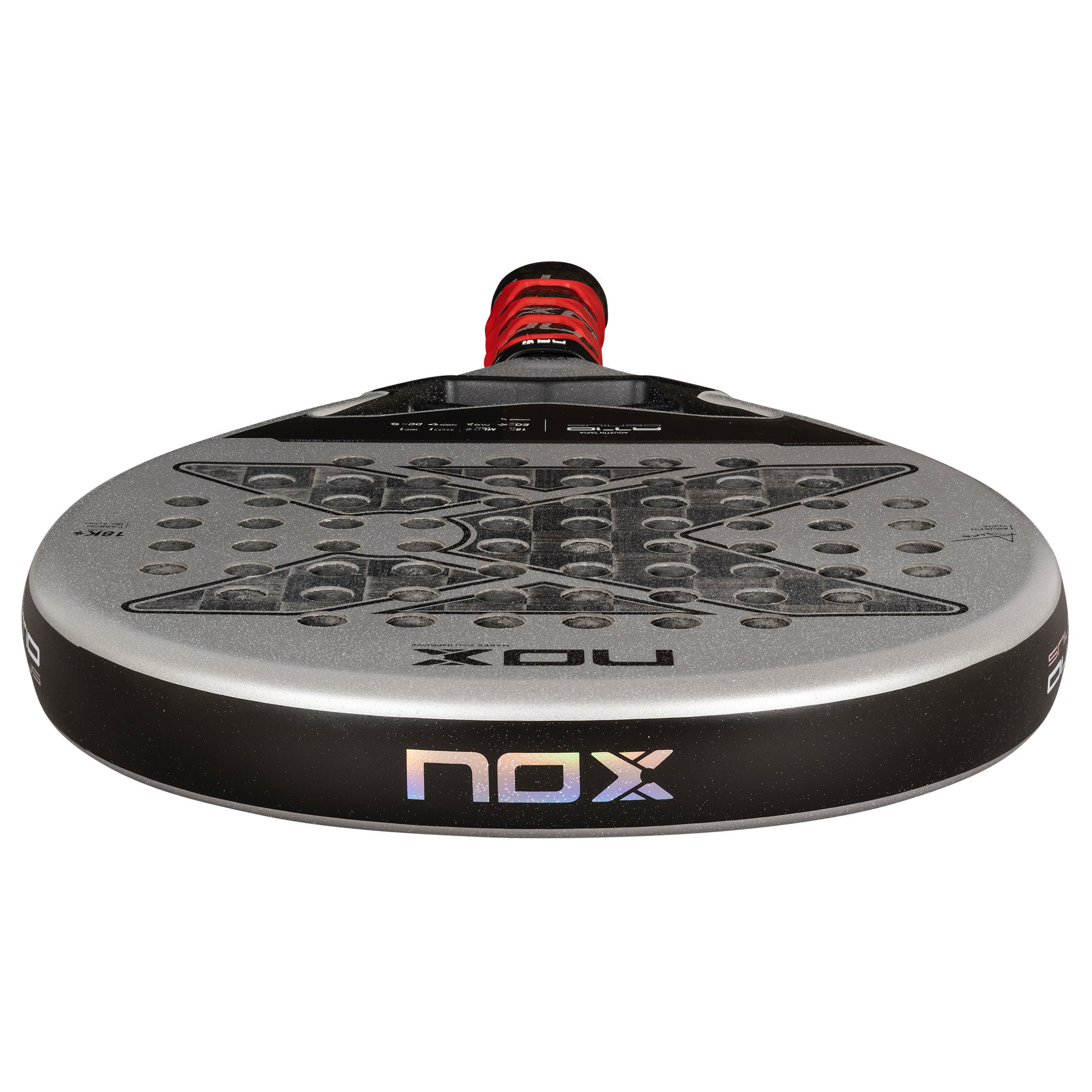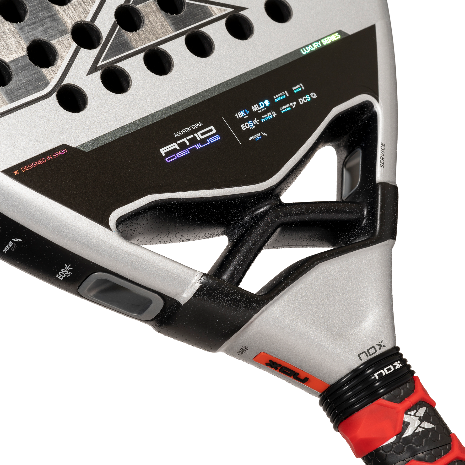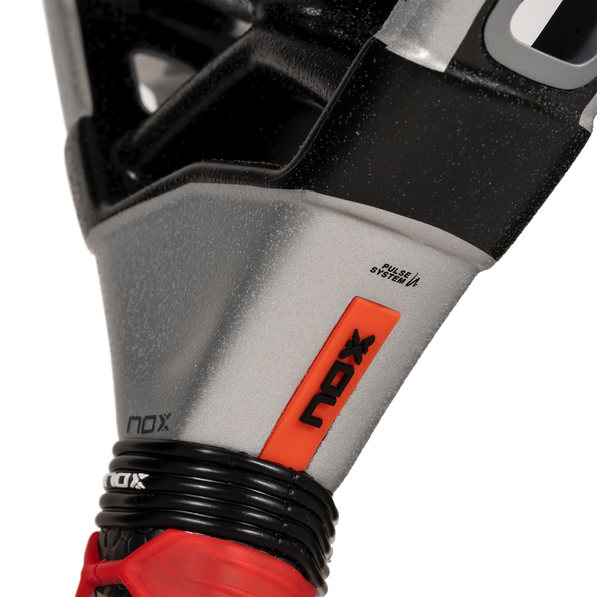 La empuñadura de la pala es el punto de unión entre tu cuerpo y tu pala y por ello hemos prestado especial atención también a esta zona de la pala. Por un lado hemos incorporado la tecnología Pulse System, dos bandas de goma diseñada para absorber vibraciones. Además, ahora de serie toda la gama Luxury incorpora la tecnología patentada NOX Custom Grip® y certificada por Testea Padel para el aumento de agarre y disminución de vibraciones.